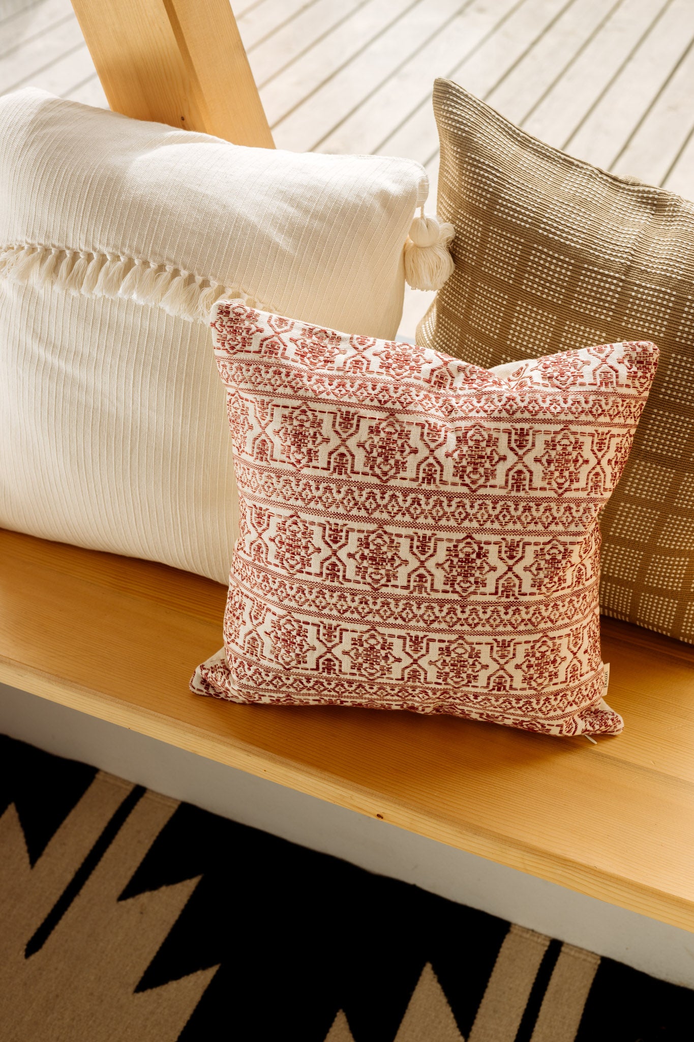 Povlak na polštářek, s péčí a láskou ručně utkaný na tradičním tkalcovském stavu. Výrazný vzor polštářku můžeme využít jako barevný akcent v kombinaci s neutrálními doplňky nebo pro vytvoření eklektického looku s jinými vzory a barvami. Se vzorem na přední straně a hladkou zadní stranou v barvě přírodní nebělené bavlny. Uzavírá se na zip.